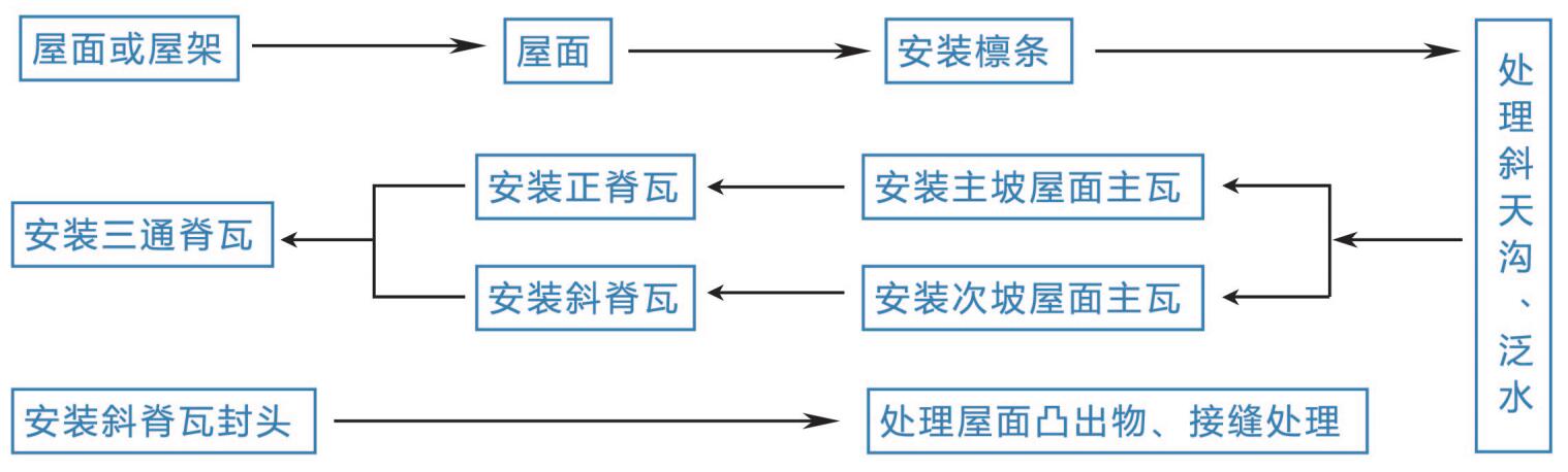 正、斜脊瓦安装搭接处应锯齐,正,斜脊瓦安装完毕后再安装三通瓦。
